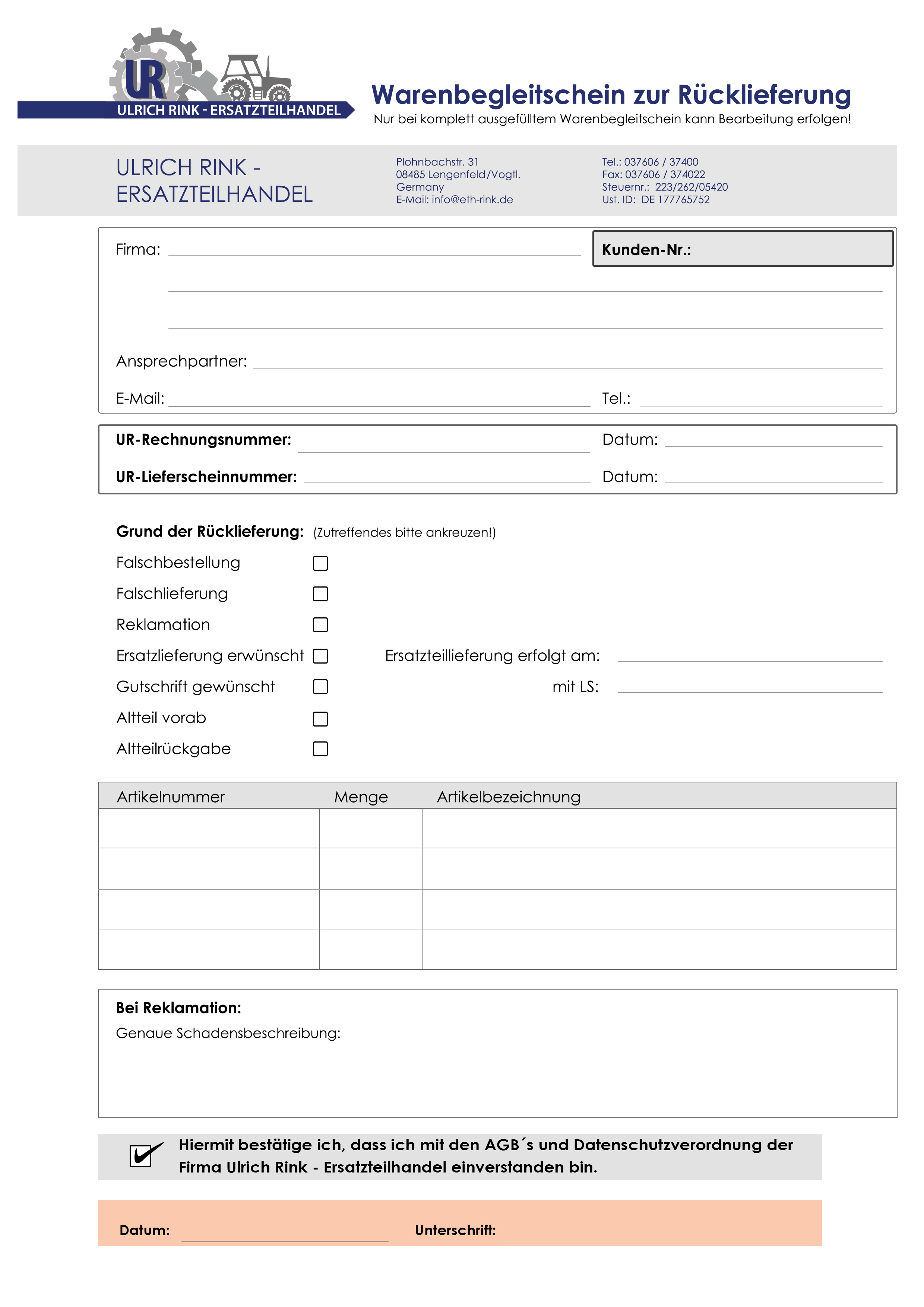 Füllen Sie das Formular bitte vollständig aus und legen Sie es Ihrer Sendung bei, damit eine reibungslose Bearbeitung möglich ist.